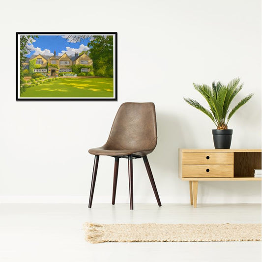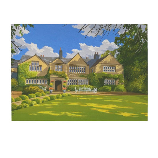 Jeremy Ford's "Happy Holidays, Holdsworth House Hotel" is a delightful gouache painting that hearkens back to the golden age of travel, reminiscent of vintage posters that beckon travellers to idyllic retreats. The artwork, 320 x 220mm in dimension, conveys the welcoming ambience of Holdsworth House, inviting viewers to step into its lush gardens and experience the charm of the historic manor.
