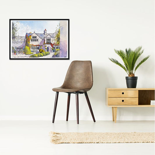 The garden, rendered with careful attention to detail, not only complements the historic manor but also provides a lush foreground that invites viewers to step through the gate into the serene world of Holdsworth House. Burnham's artwork is a testament to the manor's enduring allure and a celebration of its integration with the surrounding nature, casting the estate in a light as welcoming as the sunlit paths that lead to its doors.